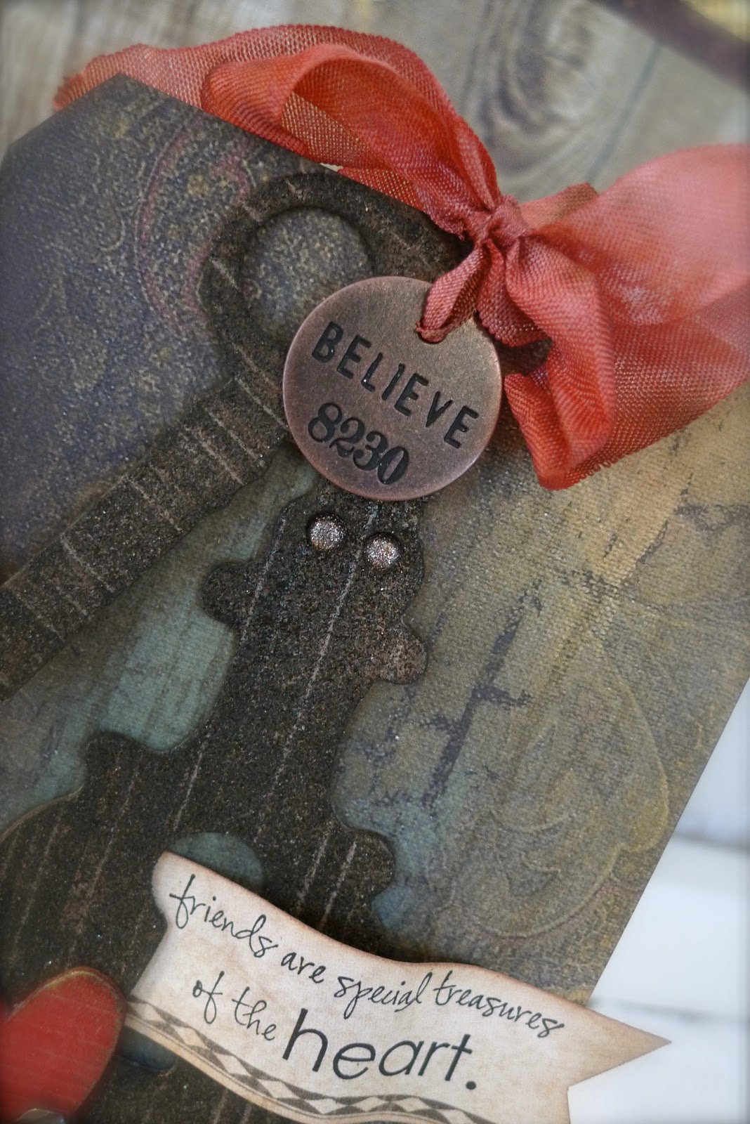 Denne gangen har jeg laget en stor tag hvor jeg har brukt et mønsterpapir på bakgrunnen. Jeg kjøpte dette papiret for flere år siden og synes det er utrolig fint. Jeg liker både fargene og mønsteret. Elementene på tagen er hentet fra et sett med grungeboardfigurer fra Tim Holtz. Jeg har farget dem med brun distress og så hatt på brunt og røft distressembossingpulver som jeg har smeltet. Jeg ville gjerne oppnå en litt rusten effekt. Jeg har stemplet teksten på en papirbanner og jeg har pyntet med metallpynt og en sløyfe farget med distress.